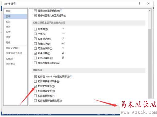 6、在“顯示”選項卡的右側窗格中,找到“打印選項”區域下的“打印文檔屬性”選項,并將其復選框勾選即可。如圖所示;
