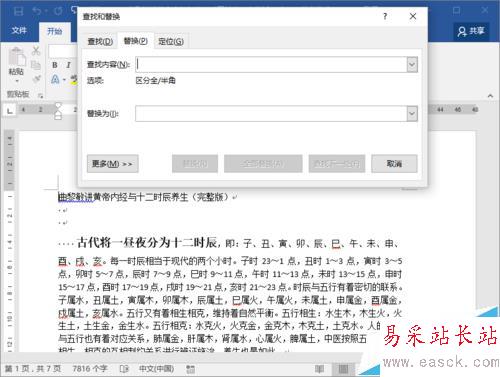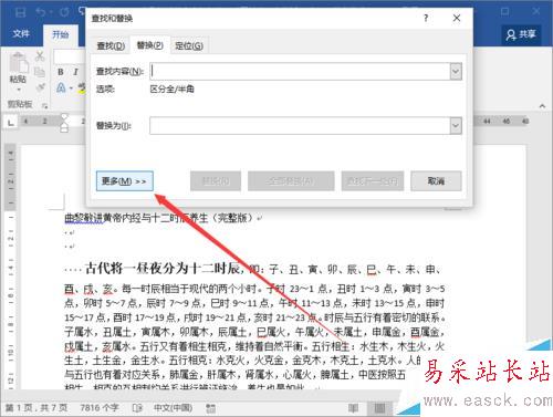 4、在“查找和替換”對話框中,點擊“更多”選項按鈕。如圖所示;