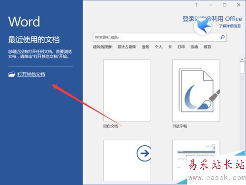 1、在計算機桌面上的Word2016文檔程序圖標雙擊鼠標左鍵,將其打開運行。并點擊“打開其他文檔”選項,打開需要進行編輯或者修改的Word文檔。如圖所示;