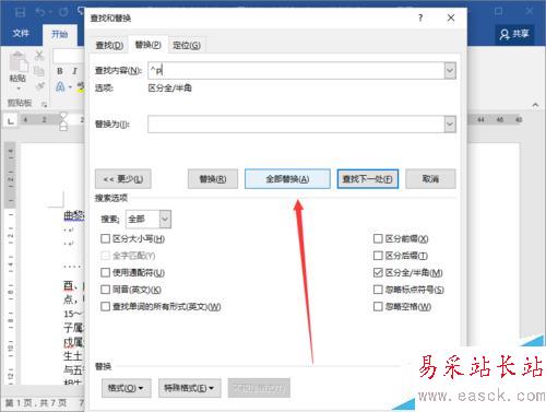 6、點擊“段落標記”后,在“查找內容”中會彈出“^p”符號,接著在點擊“全部替換”按鈕。如圖所示;