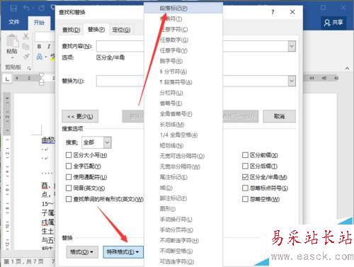 5、接著,在展現更多的“查找和替換”對話框中,依次點擊“特殊格式”-->“段落標記”命令選項。如圖所示;