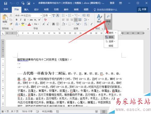 2、在打開的Word文檔窗口中,在開始菜單選項卡下,依次點擊編輯功能區的“編輯”-->“替換”命令選項。如圖所示;