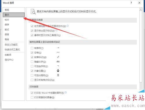 5、在“Word選項”對話窗口中,將選項卡切換到“顯示”選項卡欄。如圖所示;