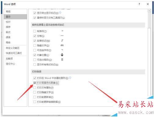 6、在“顯示”選項卡欄的右側窗格中,找到“打印選項”區域下的“答應背景色和圖像”選項,并將其勾選即可。如圖所示;