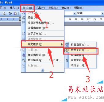 在上面那一行菜單中找“格式”。2、在下拉框中找“中文板式”。3、點擊中文板式右邊的“帶圈字符”。