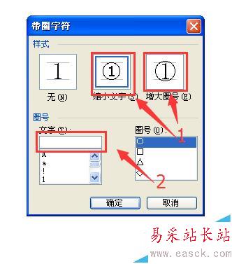 1、先來介紹圓圈字,如圖中的“1”圓圈字有兩種方式的,根據需要選擇您要的樣式,左鍵單擊選擇。在“2”的長方形框里輸數字或者字母,點擊確定就好。