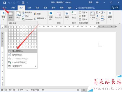 3、在插入菜單選項卡中,依次點擊“表格”功能區的“表格”-->“插入表格”命令選項。如圖所示;