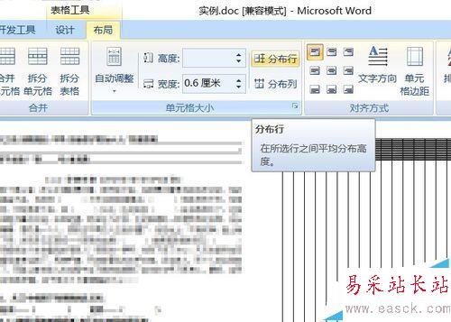 5、拉開(kāi)后,表格只是最后一行被拉長(zhǎng),如圖。選擇布局——單元格大小——分布行,將各行平均分布。