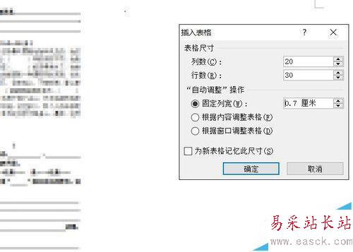 2、在插入表格面板中輸入列數(shù)與行數(shù),分別是20、30,固定列寬中輸入0.7厘米。