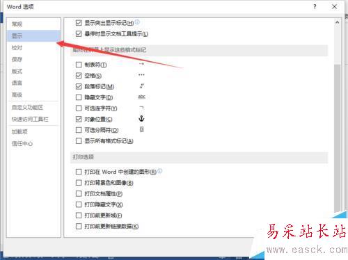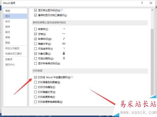6、在“顯示”選項卡的右側窗格中,找到“打印選項”區域下的“打印在Word中創建的圖形”選項,并將其復選框勾選即可。如圖所示;