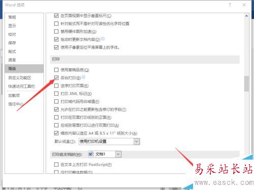 6、在“高級”選項卡欄的右側窗格中,找到“打印”區(qū)域下的“后臺打印”選項,并將其復選框勾選即可。如圖所示;