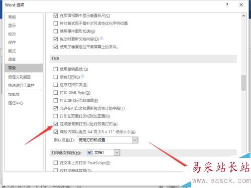 6、在“高級”選項卡欄的右側窗格中,找到“打印”區域下的“在紙張背面打印以進行雙面打印”選項,并將其復選框勾選即可。如圖所示;
