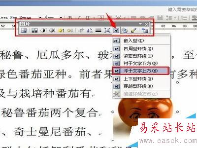 3、插入圖片后,你會發現圖片的位置與你心里所想的位置不一致,這還需要調整一番。選中圖片,出現圖片控件對話框,選文字環繞類型,若選浮于文字之上方,圖片可以任意移動,你就可以設置了。