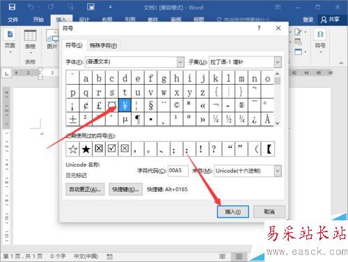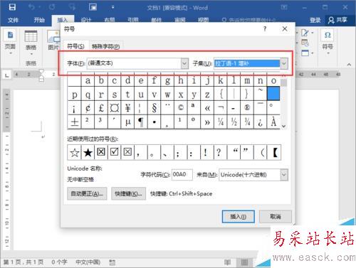 5、在符號對話框下,字體選擇“普通字體”,子集選擇“拉丁語-1 增補”。如圖所示;