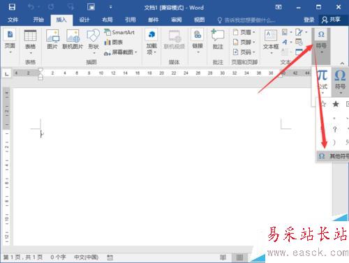 3、在插入菜單選項卡中,依次點擊符號功能區(qū)的“符號”-->“其他符號”命令選項。如圖所示;