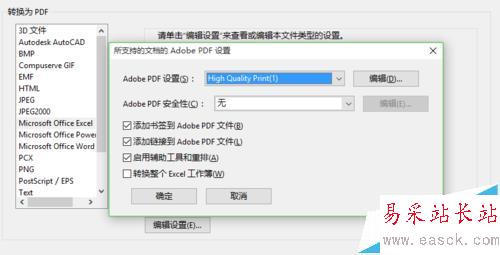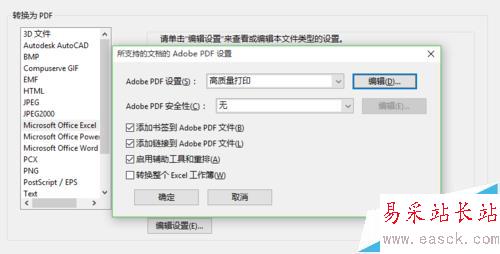 4、選擇“Microsoft Office Excel”,單擊“編輯設(shè)置”,會彈出如圖所示對話框,將“Adobe PDF 設(shè)置”設(shè)為“高質(zhì)量打印”,并單擊后面的“編輯”按鈕。