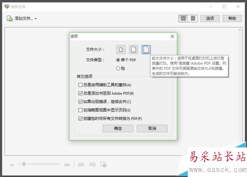 9、全部保存后,在Acrobat的啟動界面選擇“將多個文件合并為PDF”,單擊“選項”按鈕,選擇“較大文件大小”,并單擊“確定”。