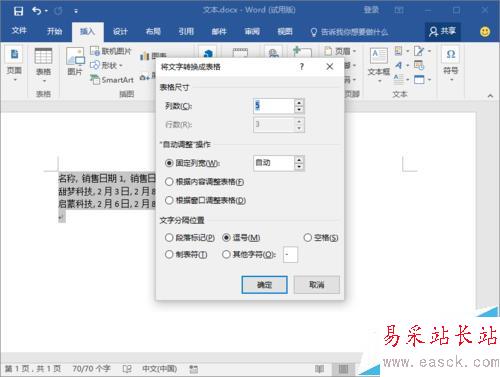 5、點擊“文本轉換為表格”選項后,這個時候會打開“將文字轉換成表格”對話框。如圖所示;