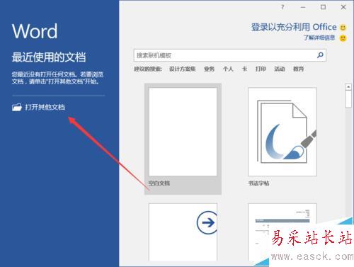1、鼠標左鍵雙擊計算機桌面Word2016程序圖標,將其打開運行。并點擊“打開其他文檔”選項。打開需要編輯的Word文檔。如圖所示;