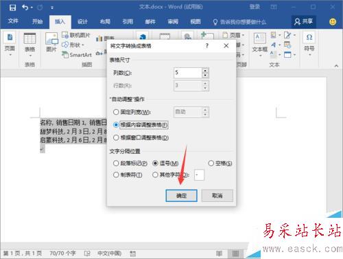 6、在“將文字轉換成表格”對話框中,選擇“自動調整操作”中的“根據內容調整表格”,而后點擊“確定”按鈕。如圖所示;