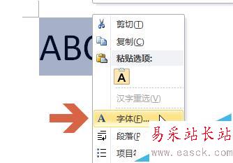 3、在選擇的文字上點擊鼠標右鍵。然后用鼠標左鍵點選彈出菜單中的“字體”。