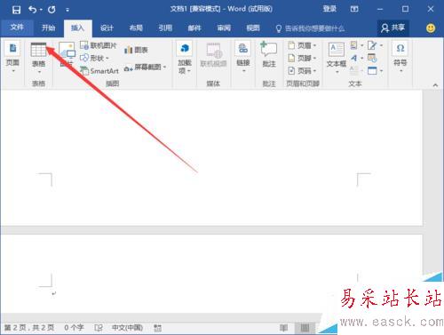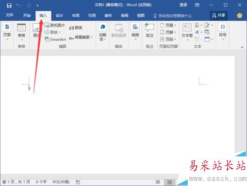 2、在新建的空白Word文檔編輯窗口,打開標題菜單欄的“插入”選項卡。如圖所示;
