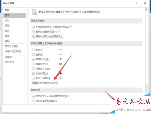 8、在顯示選項卡欄的右側窗格中,找到“始終在屏幕上顯示這些格式標記”區域下的“顯示所有格式標記”選項,并將復選框的給打上“√”,然后再點擊“確定”按鈕。如圖所示;