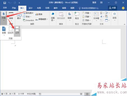 3、在打開的插入選項卡中,依次點擊“頁面”-->“分頁”選項。如圖所示;