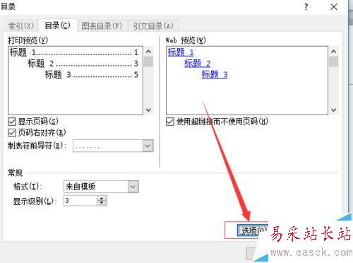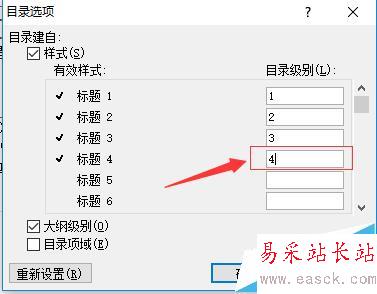 4、彈出目錄選項對話框,在紅色方框圈出的地方輸入數(shù)字“4”,然后點擊對話框下方的“確定”按鈕,設(shè)置四級標(biāo)題就完成了