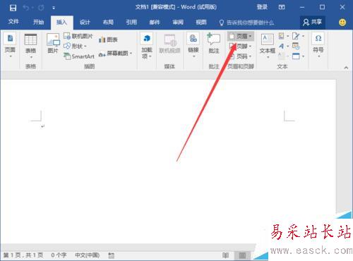 3、在打開的“插入”菜單選項卡中,點擊“頁眉和頁腳”分組功能區的“頁眉”命令選項。如圖所示;