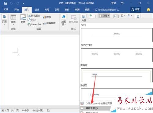 4、在彈出的頁眉選項框中,點擊“編輯頁眉”命令選項。如圖所示;