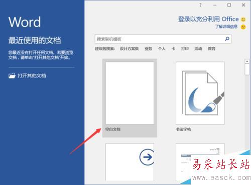1、在計算機桌面上的Word2016文檔程序圖標雙擊鼠標左鍵,將其打開運行。并點擊“空白文檔”選項,新建一個空白Word文檔。如圖所示;