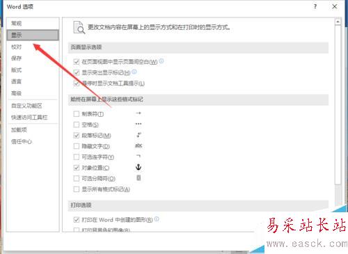 5、在“Word選項”對話窗口中,將選項卡切換到“顯示”選項卡欄。如圖所示;