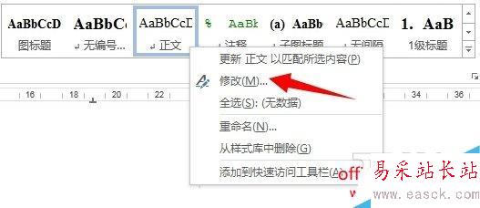 有些時候論文寫了大半或者寫完的時候需要調整論文的格式,比如正文字體變小一號,圖片變成左對齊。這里不能全選然后更改字號,這樣的話所有的字號都變成一樣的了。笨一點的辦法就是一段一段的選擇,然后調整字號。稍微聰明一點的辦法利用格式刷,一點一點的改。但是對于幾十頁甚至上百頁的文章來說是非常耗時,而且容易遺漏,導致格式前后不一致。如果寫作的時候就將樣式與內容分離開,此時只需要在樣式列表中的“正文”樣式上點擊右鍵,選擇“修改…”,如下圖所示。