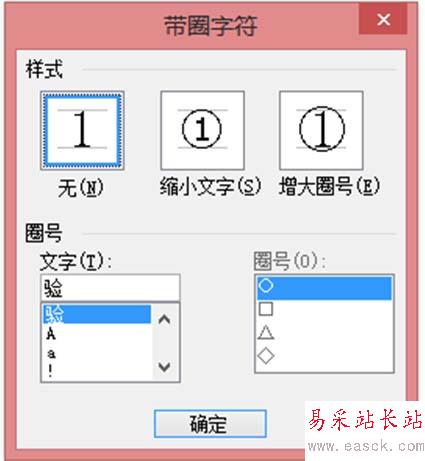 2、在帶圈字符選項(xiàng)卡中,在樣式中選擇“無”,然后確定,文字的圓圈就去掉了。
