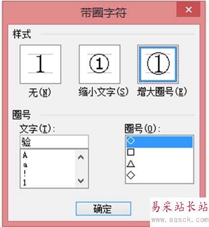 3、在帶圈字符的選項(xiàng)卡中,選擇喜歡的版式,比如“增大圈號(hào)”并點(diǎn)擊確定,文字就自動(dòng)外面帶圈了。