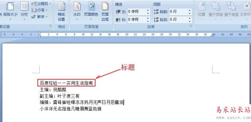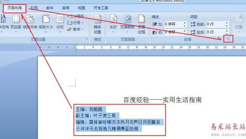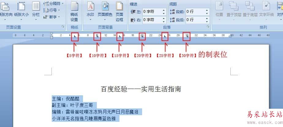 3、框選【主編】、【副主編】、【編輯】后,點擊【頁面布局】-【段落】按鈕-【制表位】。