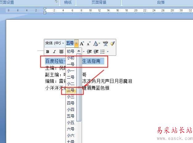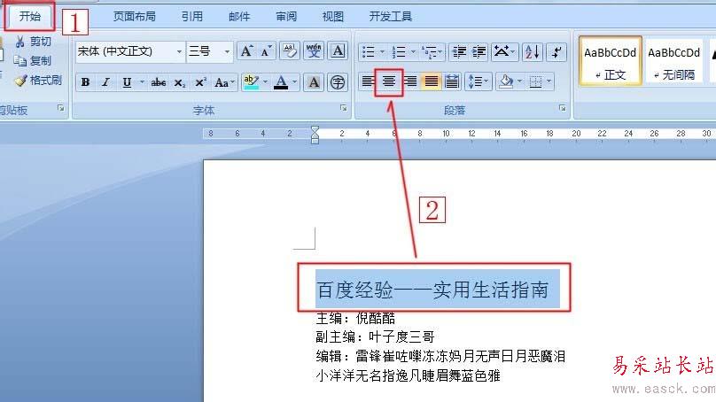 2、框選標題【百度經驗——實用生活指南】后,選擇【三號字體】、【居中】。