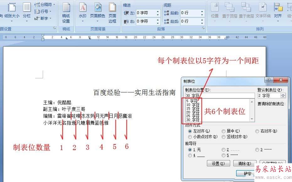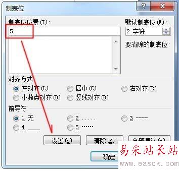 4、如以5個字符為一個制表位,6個制表位需設【5字符】、【10字符】、【15字符】、【20字符】、【25字符】、【30字符】。
