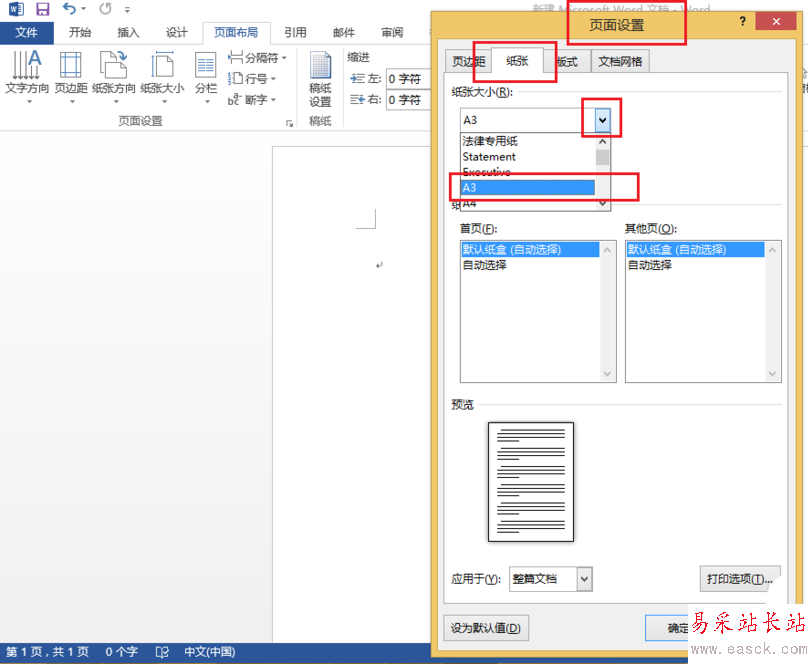3、然后回到Word文檔,查找一下是否添加有A3幅面了?