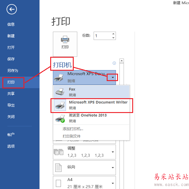 2、點擊【打印】命令;然后在【打印機】下拉的列表當中選擇一些支持打印A3幅面的打印機(例如系統的”Microsoft XPS Document Writer”虛擬打 印機),如下圖: