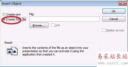 3、在彈出的窗口中選擇從文件中創建,點擊瀏覽,彈出文件選擇對話框,找到剛才保存的新word文檔