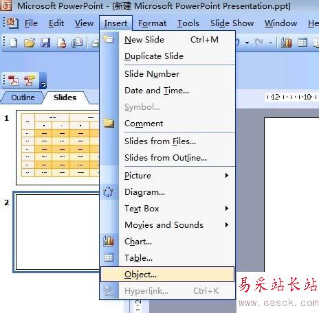 2、將要插入ppt的表格復制出來放在一個新的word文檔里面。在ppt中選擇插入,對象,如下圖所示