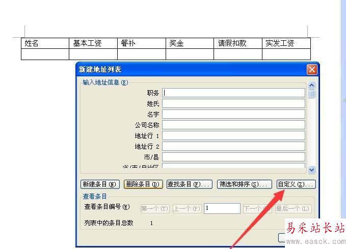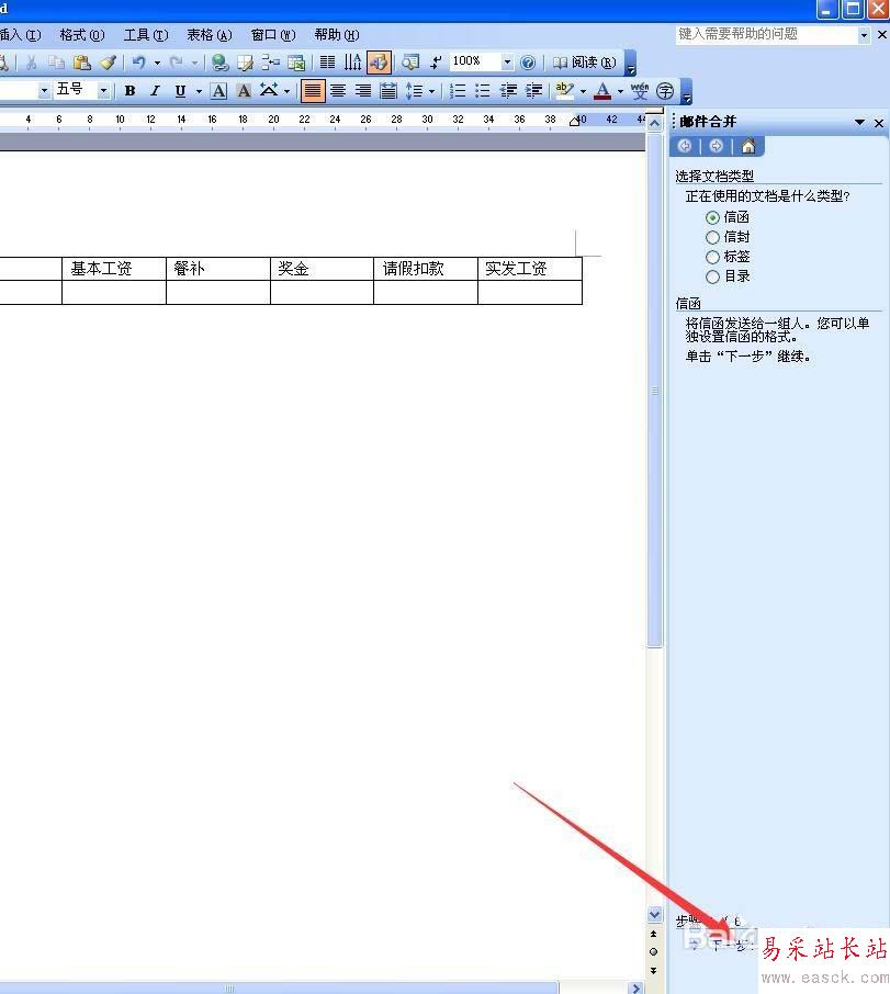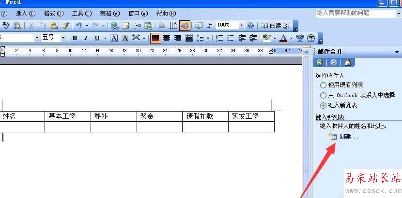 1、新建word文檔,如圖繪制一個二行的工資表,第一行為標題,即工資表的項目名稱。