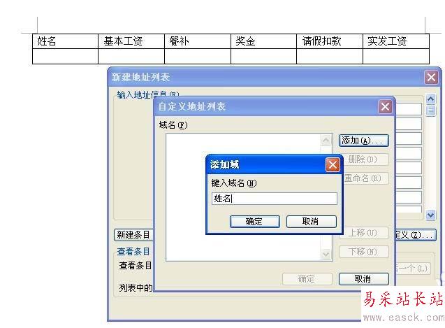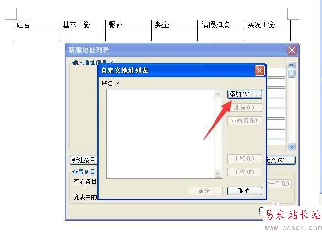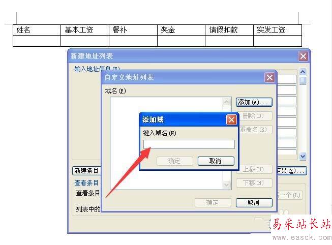 5、點擊添加,鍵入域名,即工資項目標題,錄入一個后確定,再添加下一個,一直把所有工資項目都錄完,確定。
