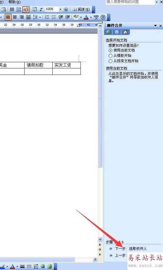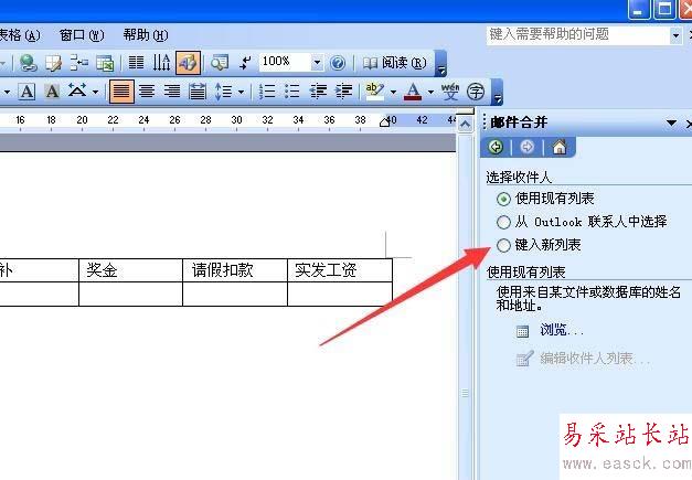 3、在右側出現的郵件合并功能底部點擊“下一步:正在啟動文檔”;繼續點擊“下一步:選取收件人”;到上部點擊“鍵入新列表”,如圖。