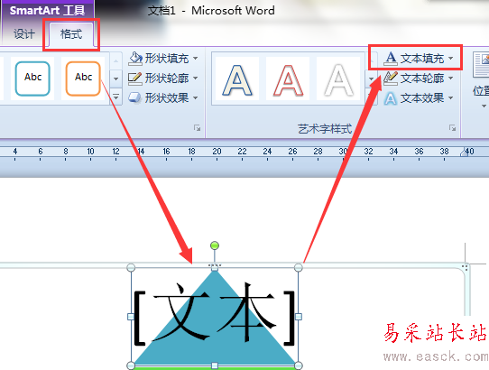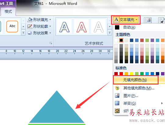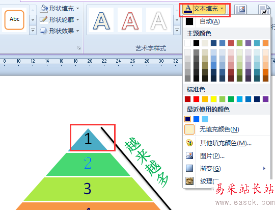 5、設(shè)文字顏色。如果因?yàn)槲覀內(nèi)サ舻奈谋咎畛渖斐蔁o(wú)法顯示文字,可以選中每一層的內(nèi)容打開(kāi)“文本填充”設(shè)置不同的顏色,按照?qǐng)D像和文章的需要來(lái)設(shè)不同的顏色或都使用一種顏色文字。