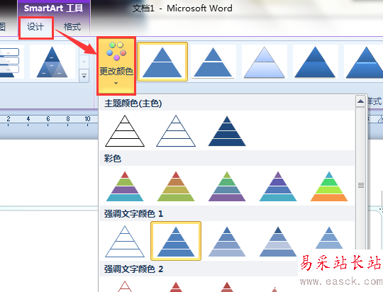 2、點(diǎn)一下圖形就可以顯示“SmartArt 工具”菜單欄,切到“設(shè)計(jì)”一欄,點(diǎn)擊下面的【更改顏色】選擇一種自己喜歡或文檔需要的顏色。比如小編這里更改顏色是“彩色范圍—強(qiáng)調(diào)文字顏色5至6”,然后“SmartArt 樣式”為“白色輪廓”。