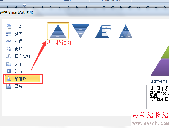 今天制作彩色金字塔形狀,需要使用“SmartArt”里面的一種棱錐圖樣式。打開(kāi)Word 2010文檔的“插入菜單”,點(diǎn)擊【SmartArt】選擇里面的“基本棱錐圖”,用于顯示比例關(guān)系、互連關(guān)系或?qū)哟侮P(guān)系,最大的部分位于最底下。