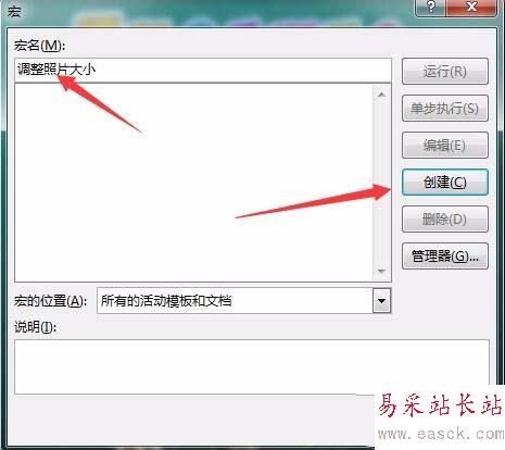 6、在打開的宏設置窗口中,為要編輯的宏設置一個名稱,如“調整照片大小”,然后點擊右側的“創建”按鈕